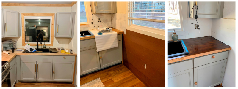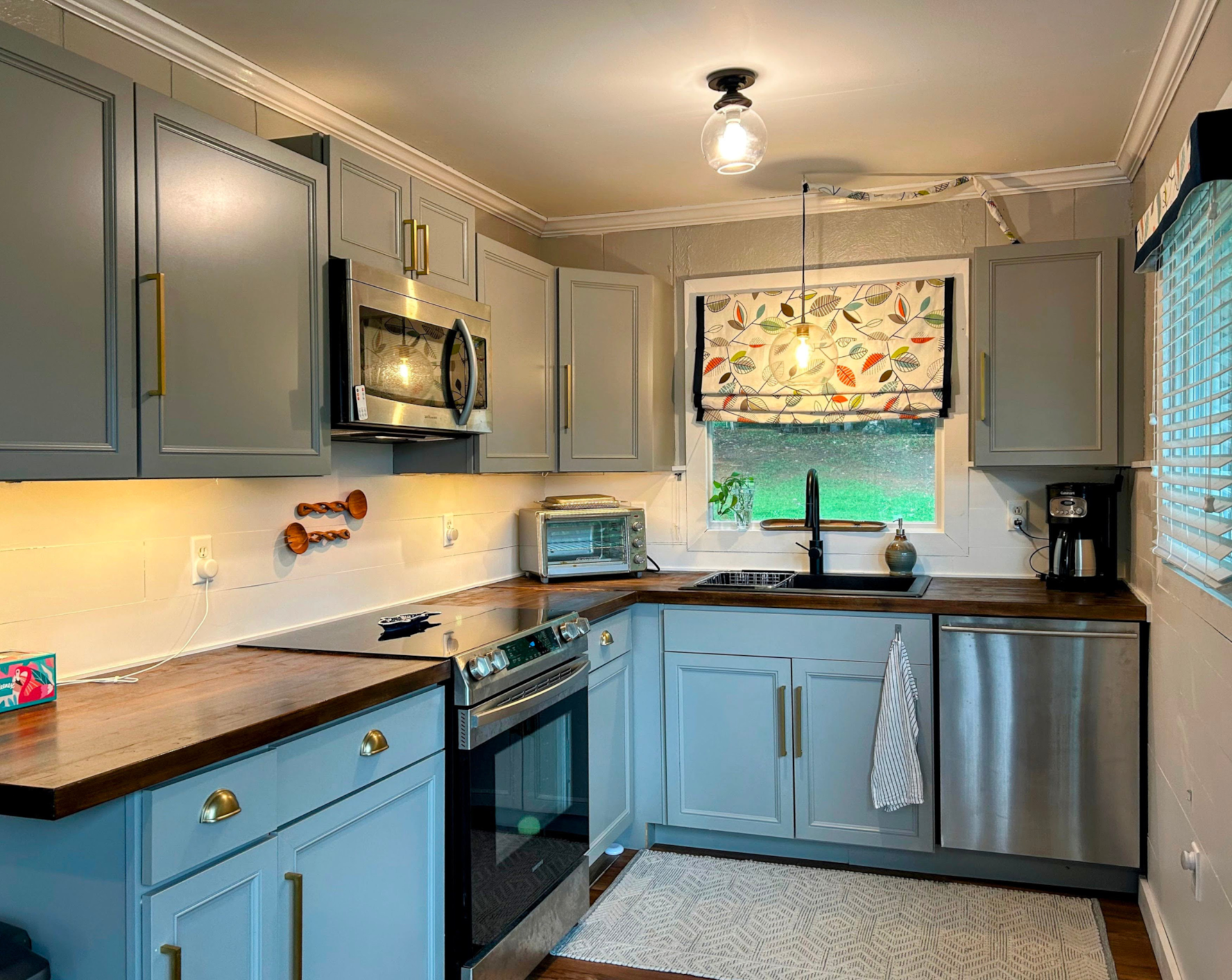 First, we added a globe light above the sink and replaced the old steel sink with a lovely black farmhouse sink and the old faucet with a stylish black pull-down faucet. We also replaced the cabinet hardware with brass pull bars, which really added a designer touch. Then, we used MDF to create paneling on the walls, and stained the butcher block walnut.