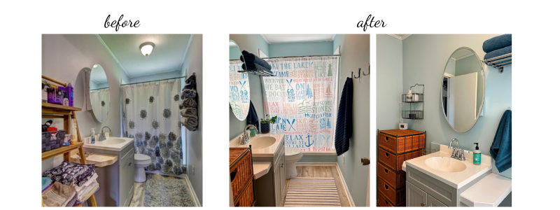 The bathroom only needed paint and a new shower curtain to brighten the entire room. It's a small bathroom, so we took advantage of the wall space above the toilet to store towels, and now the room feels a little like a retreat! :)