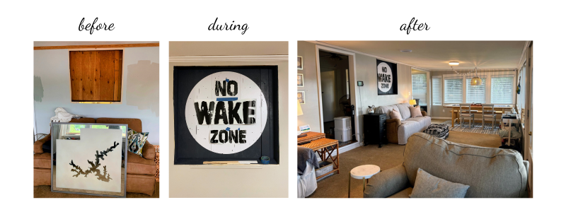 While repainting the living and dining room, we came upon a surprise hole in the wall that we think used to be a window on the original house looking over the porch that is now the living and dining room. We were stumped with what to do with it for a while until inspiration hit me, and viola, DIY art!